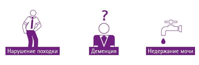 Для НТГ характерна неврологическая сиптоматика дилатации желудочков при отсутствии повышенного давления ЦСЖ. Клиническая картина НТГ характеризуется сочетанием трех симптомов: нарушение походки (широкая, шаркающая походка, магнитная походка), недержание мочи и деменция.