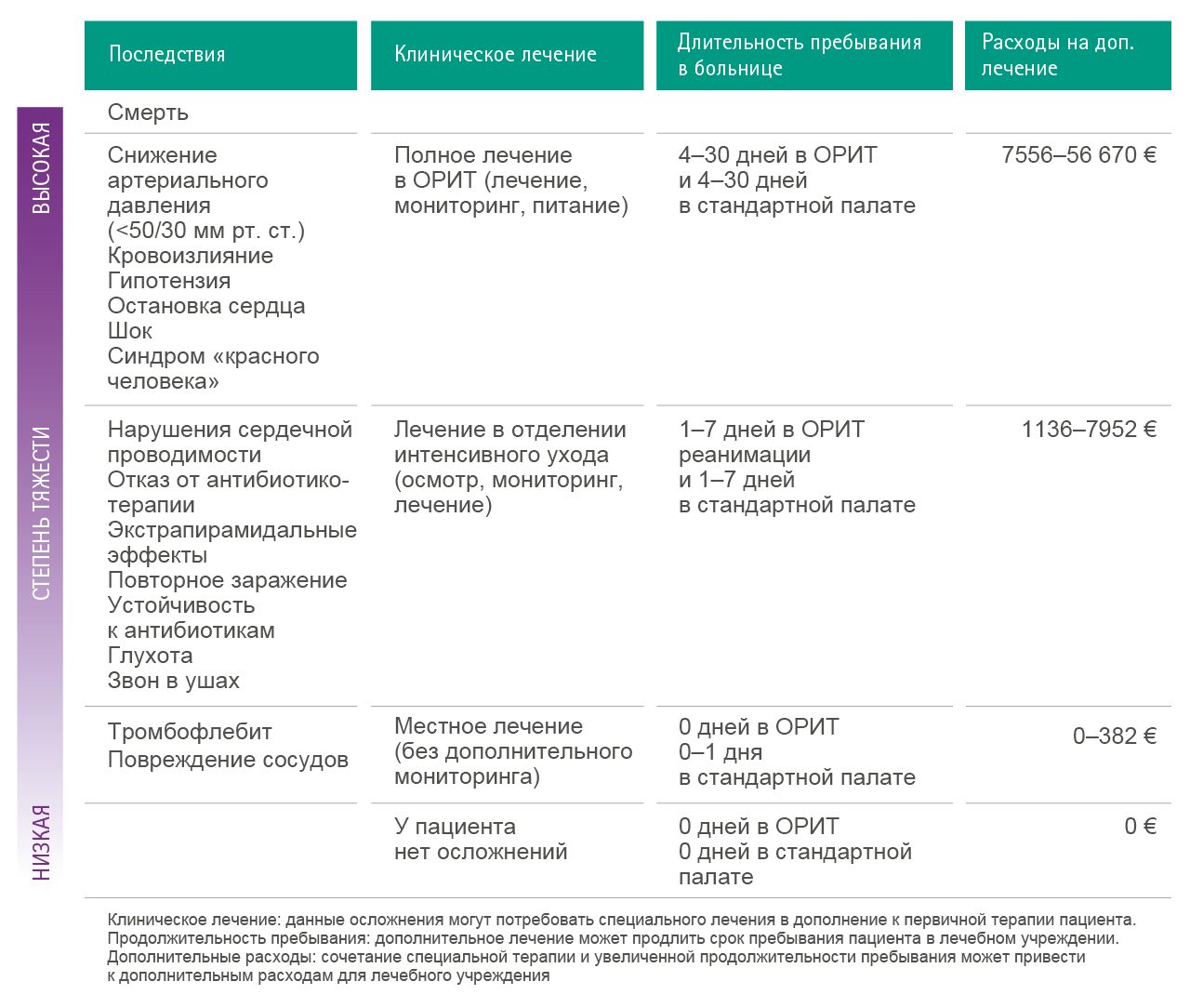 Оценку стоимости риска следует проводить путем определения затрат на соответствующее клиническое лечение и, как следствие, на более продолжительное пребывание в стационаре. Стоимость может быть рассчитана с использованием средней ежедневной стоимости предполагаемого лечения 30, 31. На рисунке ниже показаны результаты расчета для отдельных типов осложнений.