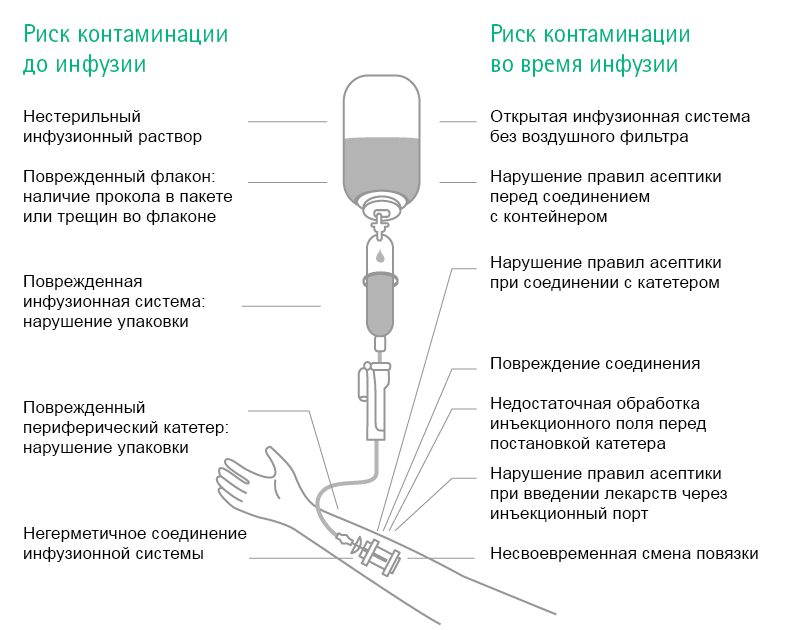 Микробиологическое загрязнение представляет особую угрозу для пациентов, которым проводится инфузионная терапия и установлен внутривенный катетер. В этом случае патогенные микроорганизмы напрямую попадают в сосудистое русло и могут стать причиной катетер-ассоциированной инфекции кровотока (КАИК) или доставляться к органам и системам, приводя к органной недостаточности.