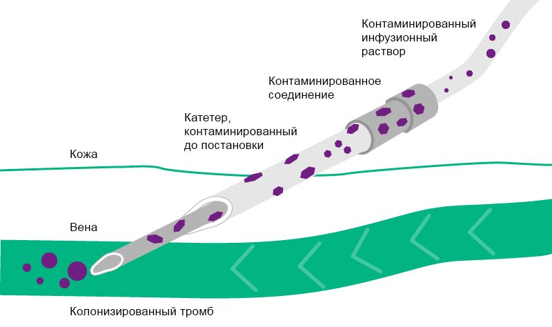 Относительно инфекций, обусловленных инфузией, существует два отдельных пути контаминации: внепросветный и внутрипросветный. Внутрипросветная контаминация — последствие нарушения правил использования инфузионной системы, например, муфты катетера во время соединения и отсоединения инфузионной системы. Это наиболее распространенный источник инфекции после первой недели постановки катетера 11–13.