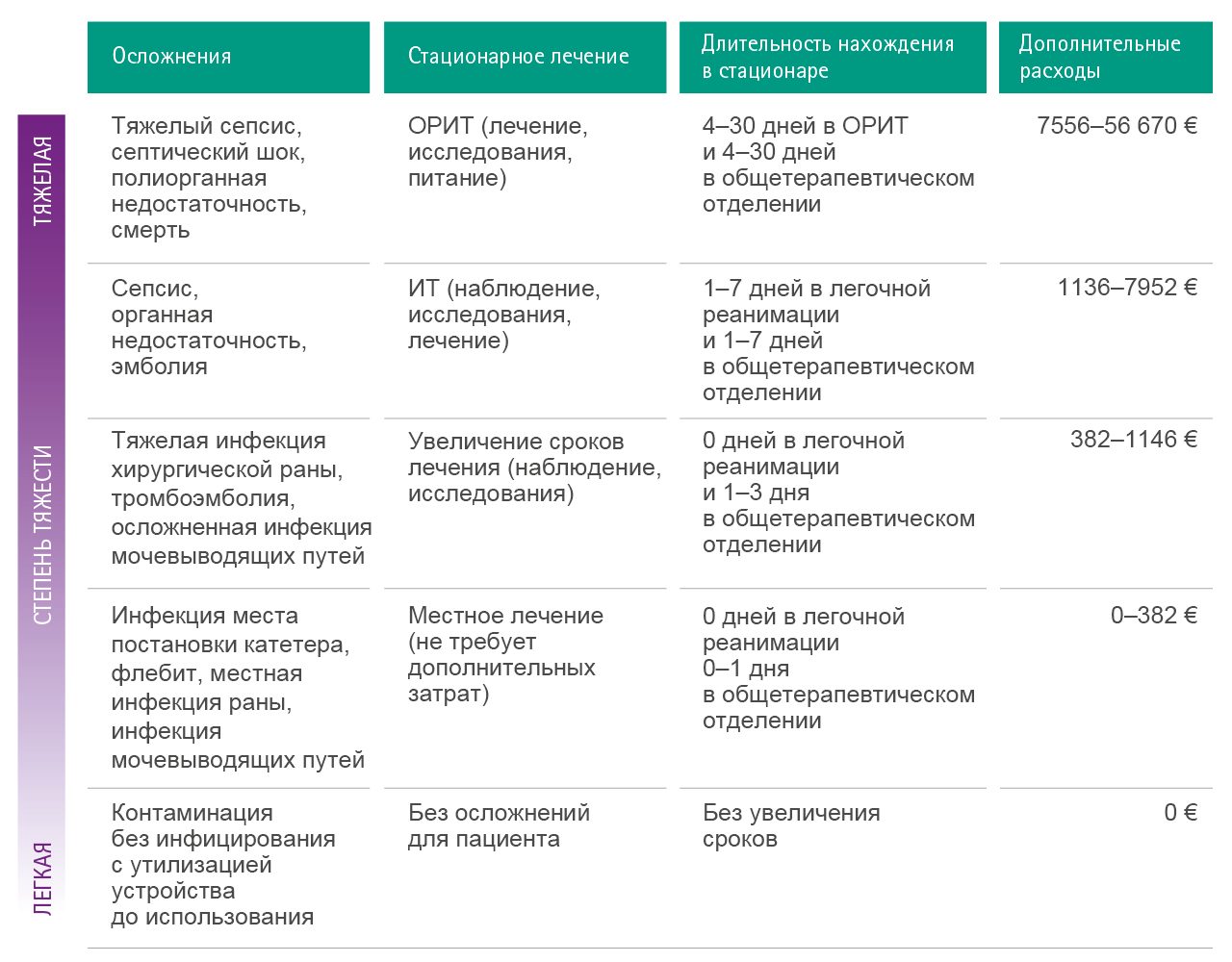 В исследовании, проведенном Rello, при оценке последствий инфицирования места установки катетера у пациентов в критическом состоянии было установлено, что сроки пребывания в стационаре выживших пациентов увеличились на 19,6 дней 42. Речь идет только о добавленной стоимости одного койко-дня в размере 3214 €, без учета всей длительности пребывания и расходов на диагностические и лечебные процедуры.