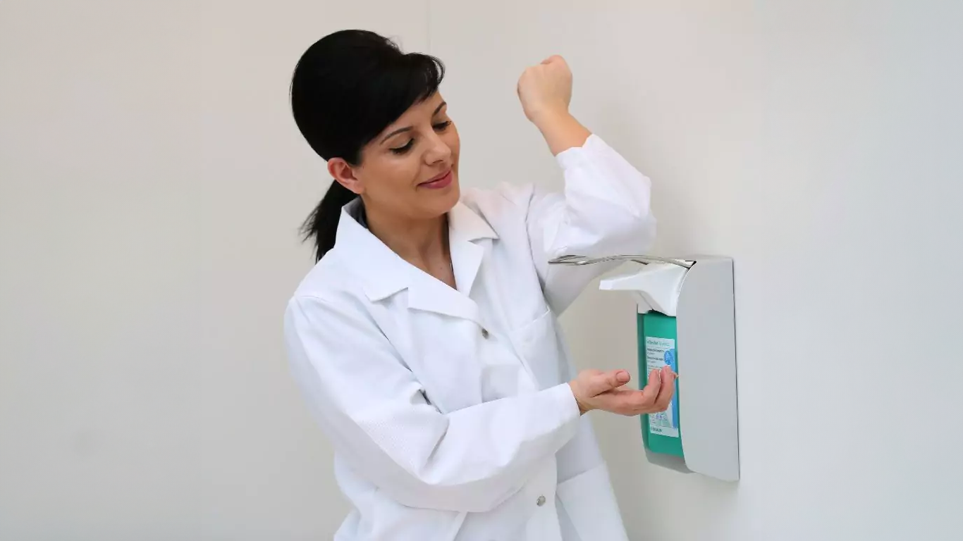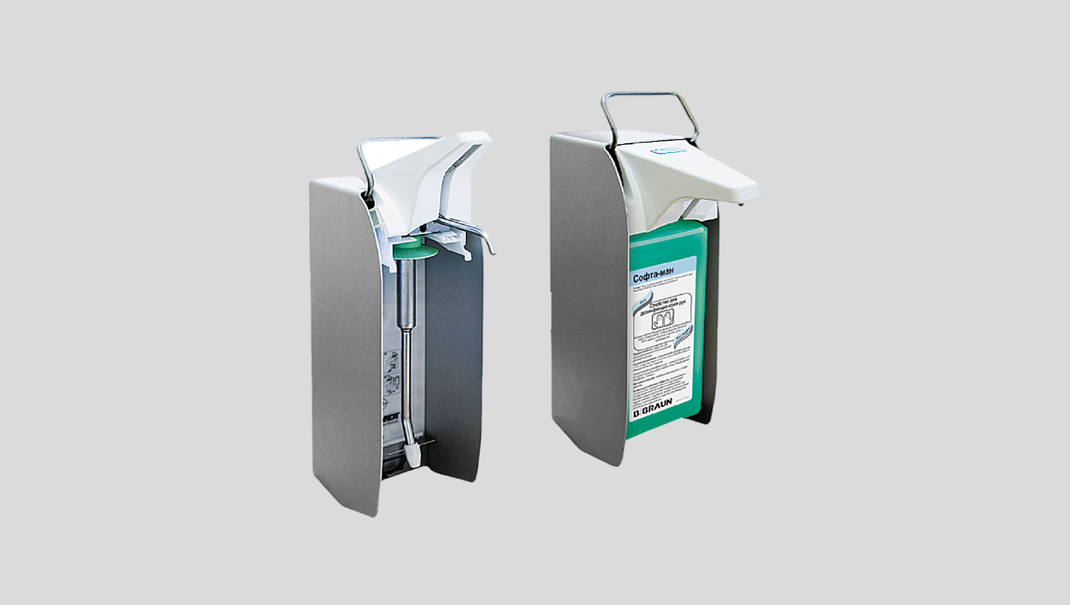 Настенный Беcконтактный дозатор 1000 мл. Корпус выполнен из анодированного алюминия, рычаг (укороченный) и помпа из нержавеющей стали. Помповое устройство легко извлекается из корпуса дозатора с лицевой стороны (не требуется снимать дозатор со стены). Дезинфекция помпового устройства может проводиться с помощью дез. средств или автоклавирования.